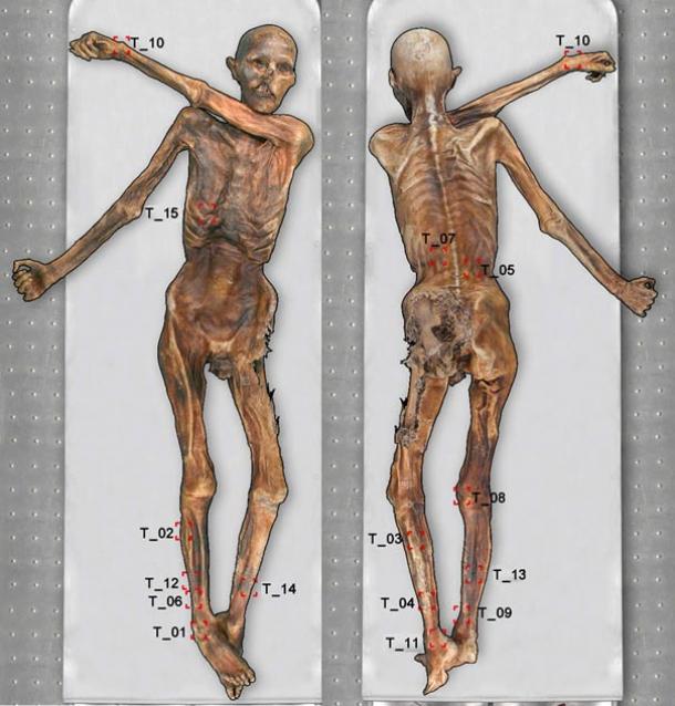 Incluso sus tatuajes fueron sometidos a escrutinio. Como antiguos orígenes informó en 2013, los tatuajes puede haber sido una forma de acupuntura antigua. Los científicos del estudio de 2013 explicó: "Las imágenes radiológicas de las áreas tatuadas muestran áreas degenerativas bajo los tatuajes que podrían haber causado el dolor, ya que los puntos de tatuaje se encuentran aproximadamente sobre las medianas de acupuntura, parece la opinión común de que podrían haber sido utilización para tal ".